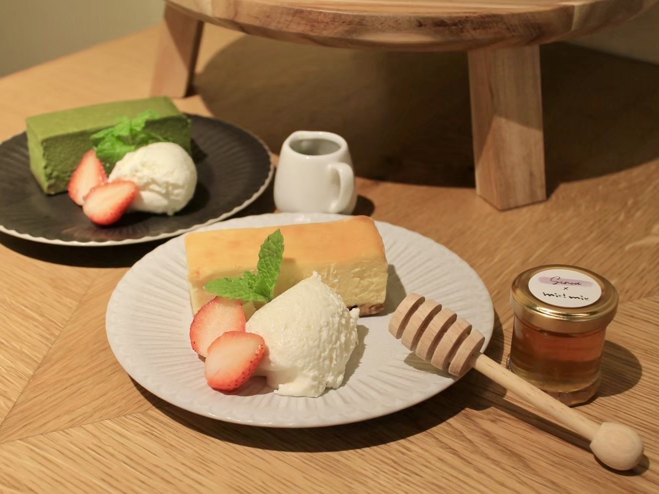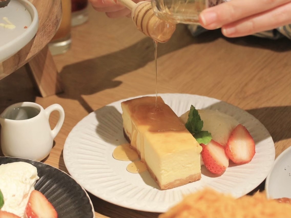 クリームチーズとグラナパダーノを使ったチーズケーキに、京都のハチミツ専門店「miel mie(ミールミィ)」のハチミツをお好みでかけていただきます。