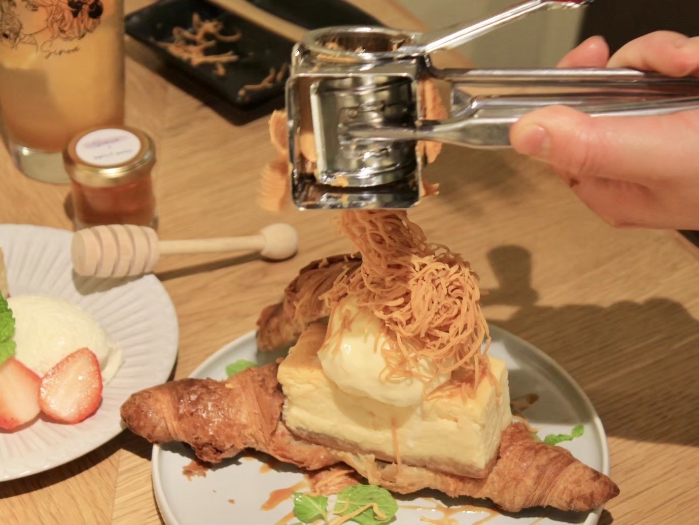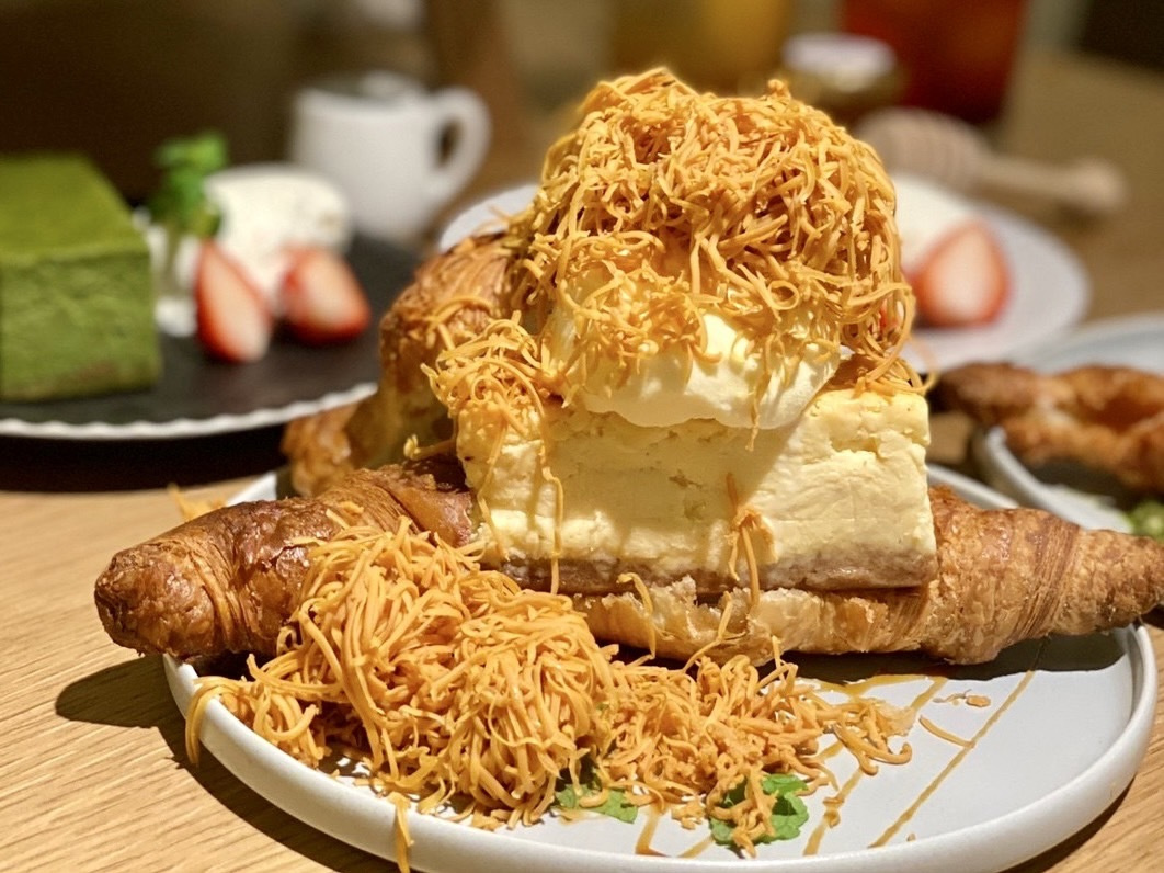 クロワッサンにチーズケーキとアイスクリームを挟み、キャラメルのような味わいのスキクイーンチーズを目の前で削ってたっぷり乗せてくれます!
