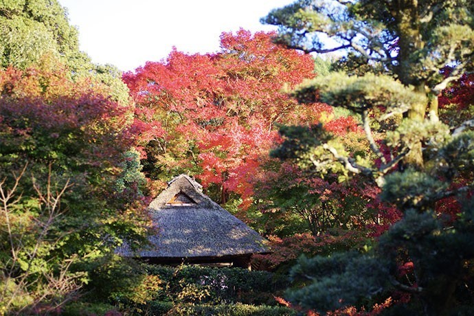 芭蕉庵の茅葺き屋根に積もった紅葉。