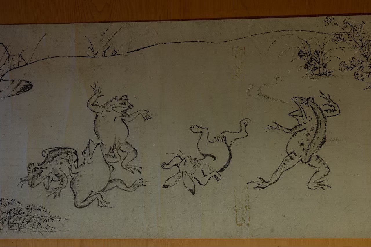 教科書やテレビ、グッズでもおなじみの有名な絵巻で、兎や蛙、猿などが擬人化され、生き生きと描かれています。