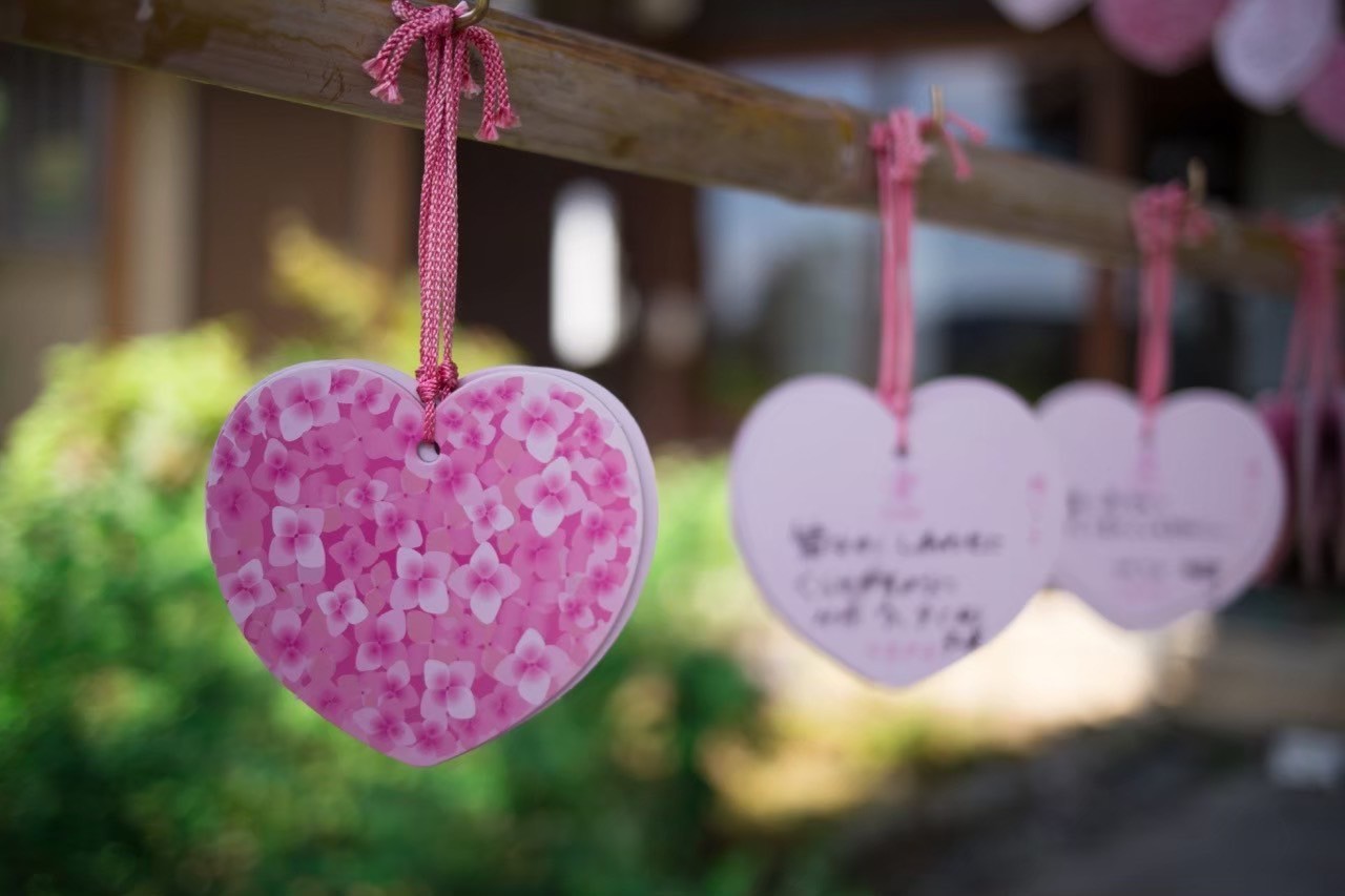 本堂の近くには、かわいらしいハート型の絵馬やあじさいのお守りも。