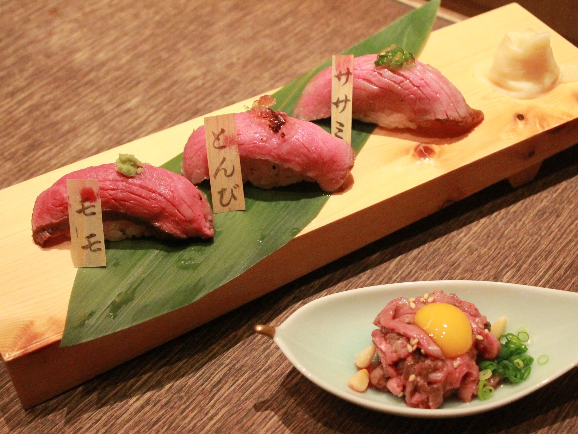 肉寿司はおすすめの握りを3貫。それぞれの部位に適した調理法と薬味で味付けされているのでパクっとそのまま!