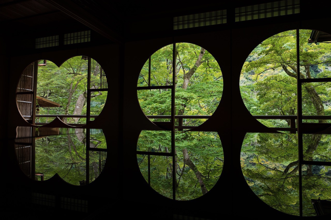 次の部屋では、大きな丸窓が連なっていた。先ほどの部屋より室内が暗い分、机に反射した緑がより一層際立っている。どの窓から見える木々も同じはずなのに、角度が変わると表情がわずかに違って見えた。まるで映画館に座って、いくつものスクリーンを眺めているようだ。木々の緑が優しく揺れると、テーブルの上の青葉も共鳴していく。